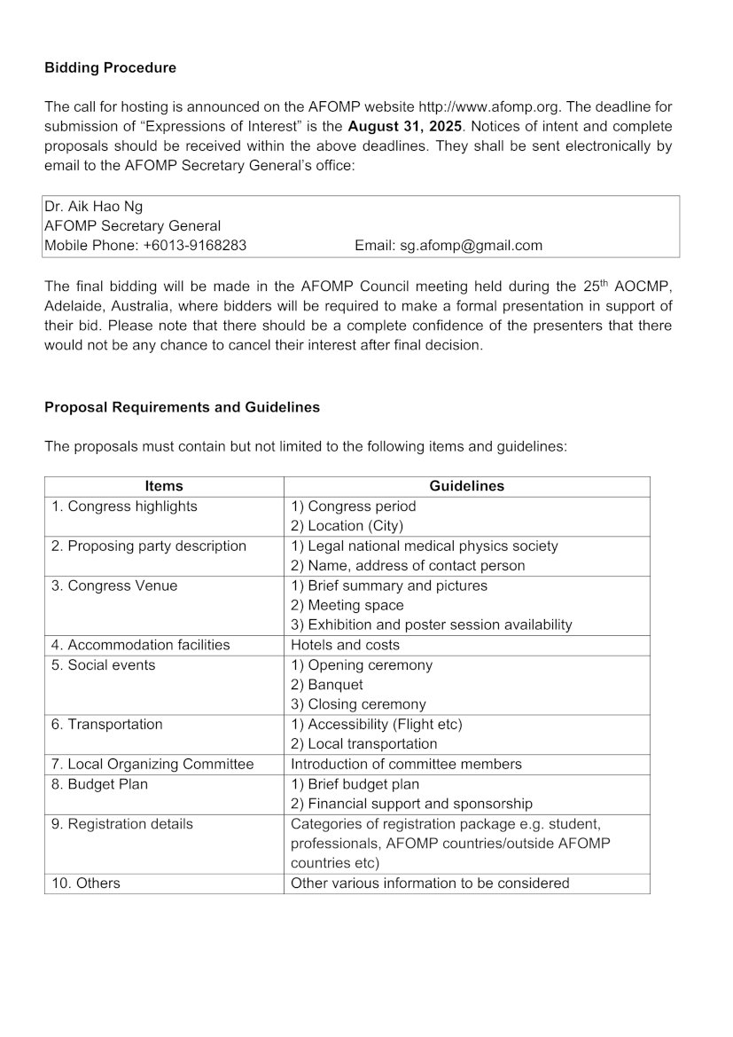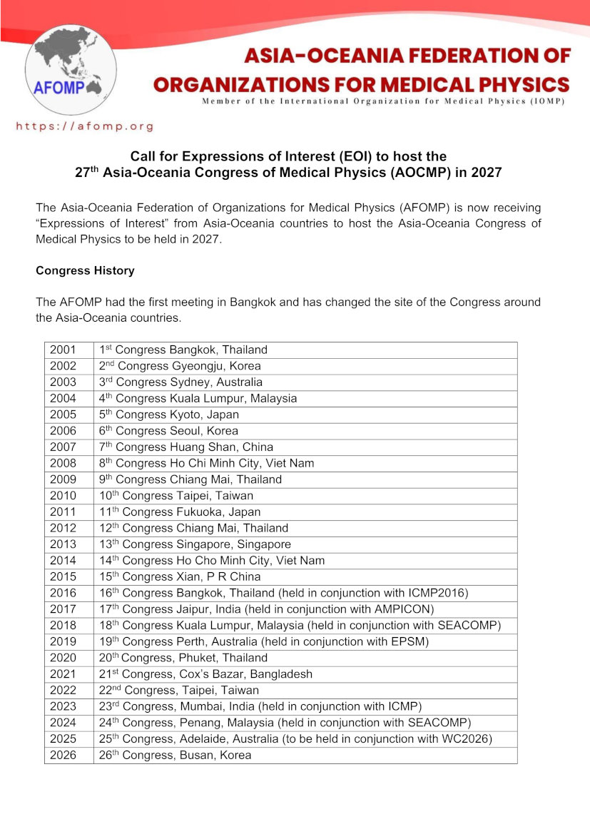 Call for Expressions of Interest (EOI) to host the 27th Asia-Oceania Congress of Medical Physics (AOCMP) in 2027
