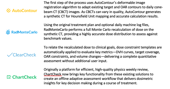 Building on the seamless integration of ChartCheck with ARIA, Radformation has released ChartCheck Adaptive™: a zero-click automated offline adaptive assessment solution designed to help radiotherapy clinics consistently evaluate anatomy changes and dose delivery (daily and accumulated) using the daily CBCT images acquired during treatment.