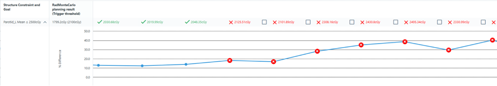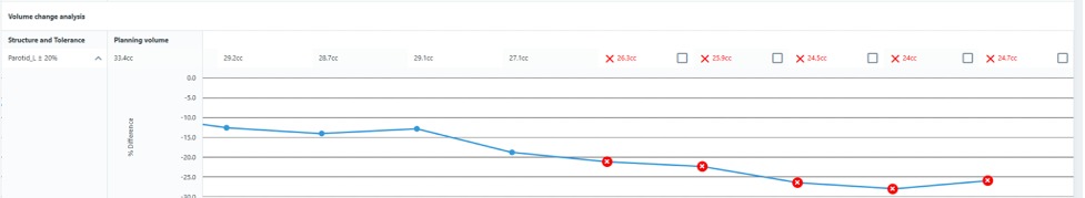 Fraction-by-fraction dose and volume changes are automatically assessed against predefined tolerance thresholds for selected OARs, with the ability to track longitudinal trends across all contoured structures using customizable templates