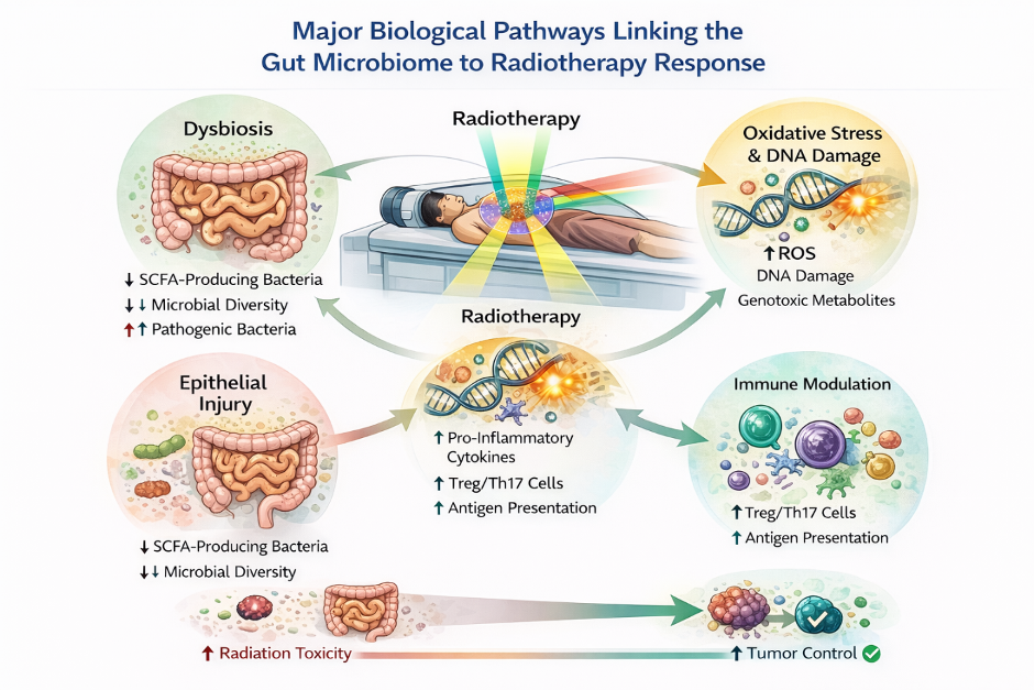 Radiotherapy induced dysbiosis amplifies oxidative stress, DNA damage, inflammatory cytokine release, and immune dysregulation. Altered antigen presentation and imbalance between regulatory (Treg) and effector (Th17/CD8⁺) immune cells influence both tumour control and normal tissue injury. These pathways operate independently of physical dose parameters and help explain inter-patient variability in outcomes.