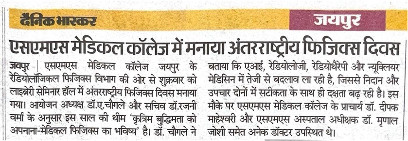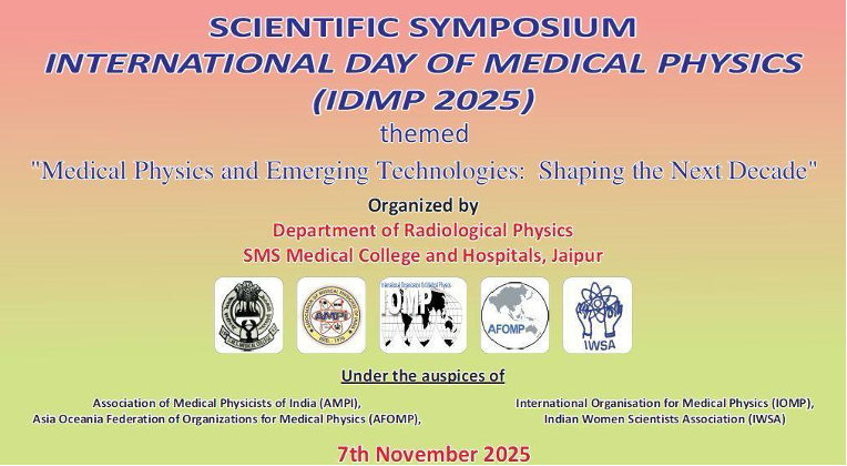 The Department of Radiological Physics, SMS Medical College & Hospital, Jaipur, organized a One-Day Scientific Symposium on the occasion of the International Day of Medical Physics (IDMP 2025) on 7th November 2025 at the SMS Medical College Library Hall. The event was conducted under the banner of the Association of Medical Physicists of India (AMPI) and the AMPI–Northern Chapter, and was endorsed by the International Organization for Medical Physics (IOMP), the Asia-Oceania Federation of Organizations for Medical Physics (AFOMP), and the Indian Women Scientists’ Association (IWSA).